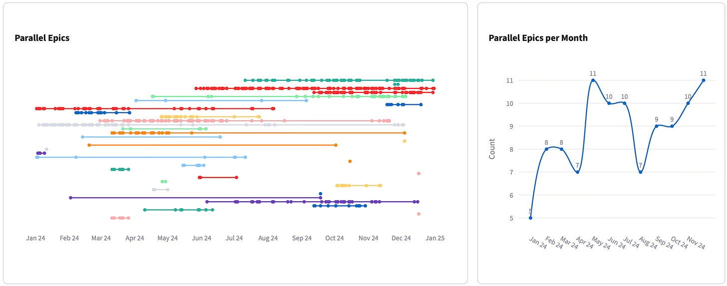 We can aggregate this activity to the Epic level to see how many large value streams are being worked on at the same time.